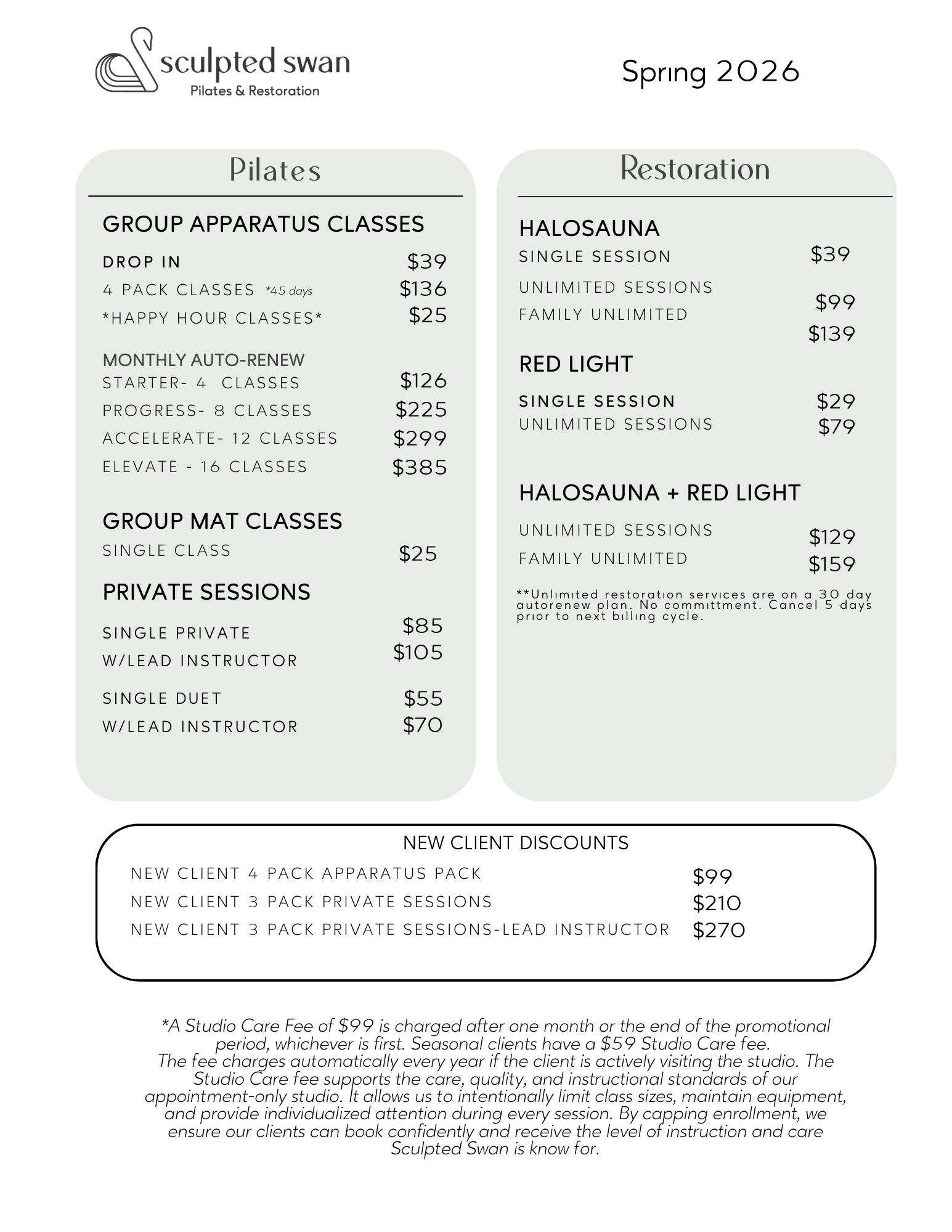 To support the quality of your experience at Sculpted Swan, a Studio Care Fee of $99 is charged after one month or the end of the promotional period, whichever is first.. The Studio Care fee supports the care, quality, and instructional standards of our appointment-only studio. It allows us to intentionally limit class sizes, maintain equipment, and provide individualized attention during every session. By capping enrollment, we ensure our clients can book confidently and receive the level of instruction and care Sculpted Swan is know for.