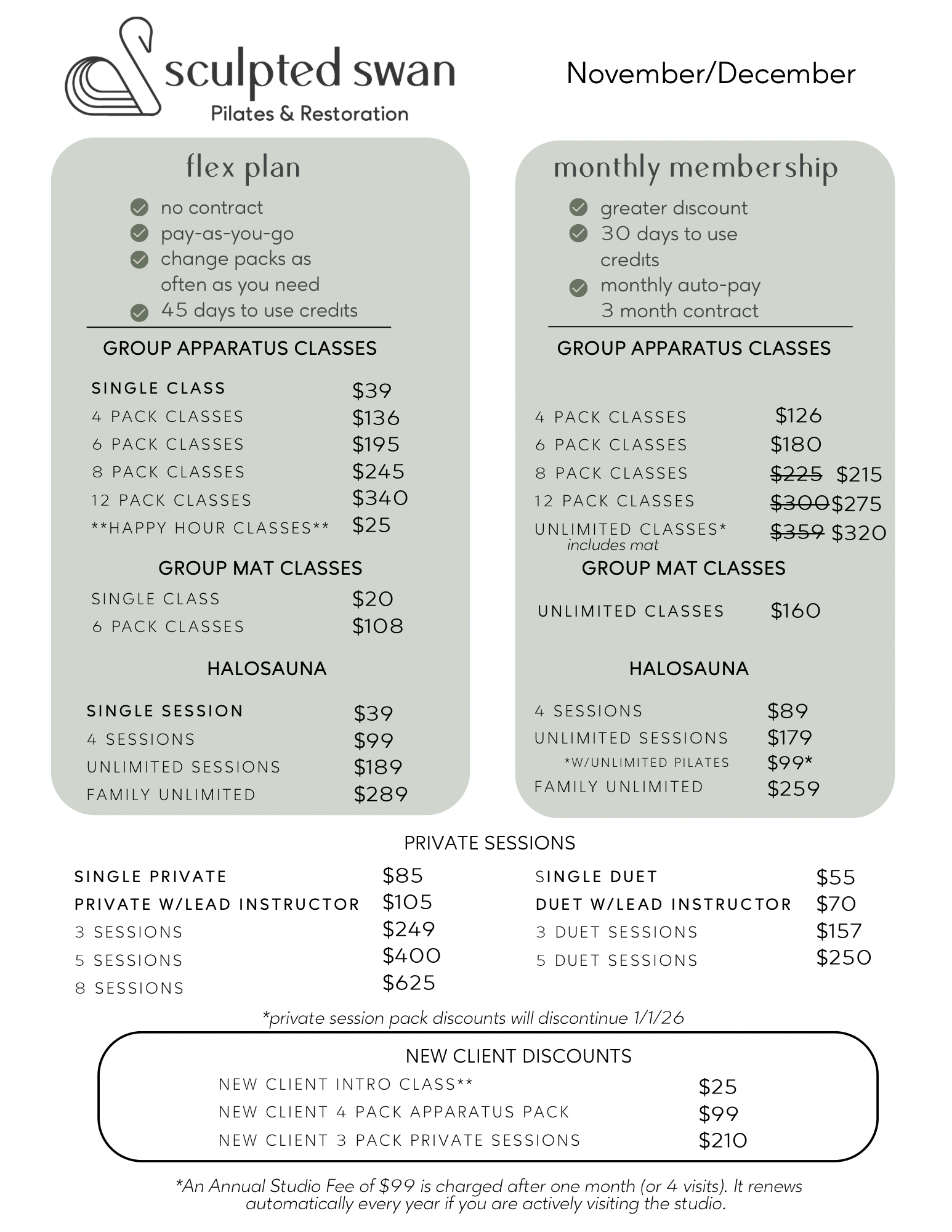 To support the quality of your experience at Sculpted Swan, a $99 annual studio fee is applied to each client after one month of participation- or 4 classes/private sessions. This fee helps us maintain our small class sizes, high-quality equipment, and personalized instruction.